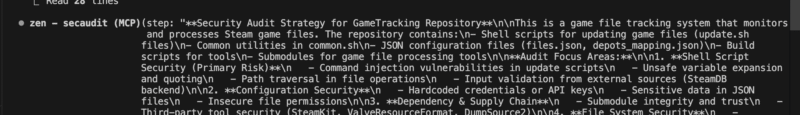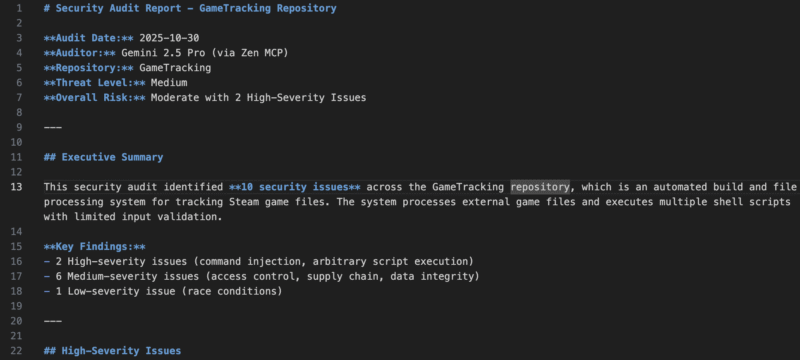 After prompting it further to go deeper, we received more information about the security of the repo, which we then asked zen to generate a document in markdown file.